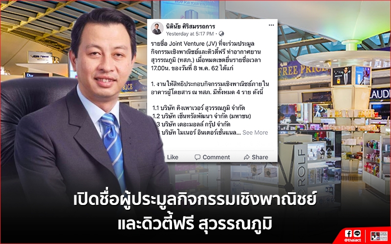 นายนิตินัย ศิริสมรรถการ กรรมการผู้อำนวยการใหญ่ บริษัท ท่าอากาศยานไทย จำกัด (มหาชน) ได้โพสต์ข้อความในเฟซบุ๊กส่วนตัว เปิดเผย รายชื่อกิจการร่วมค้าที่จะร่วมประมูลกิจกรรมเชิงพาณิชย์และดิวตี้ฟรี ท่าอากาศยานสุวรรณภูมิ ดังนี้