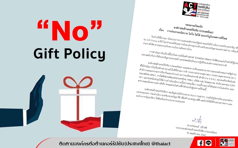เมื่อวันที่ 25 พ.ย. 61 องค์กรต่อต้านคอร์รัปชัน (ประเทศไทย) หรือ ACT ออกจดหมายเปิดผนึก เรื่อง การประกาศนโยบาย ไม่รับ ไม่ให้ ของขวัญในเทศกาลปีใหม่ โดยในจดหมายเปิดผนึกระบุว่า