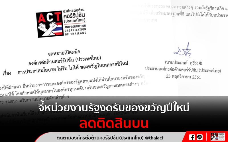 องค์กรต่อต้านคอร์รัปชัน (ประเทศไทย) หรือ ACT ออกจดหมายเปิดผนึก เรื่อง การประกาศนโยบายไม่รับ ไม่ให้ ของขวัญในเทศกาลปีใหม่ โดยในจดหมายเปิดผนึกระบุว่าในช่วงปีที่ผ่านมามีหน่วยราชการและองค์กรของรัฐหลายแห่งได้นำนโยบายงดรับของขวัญ หรือ No Gift Policy มาใช้ โดยกำหนดให้บุคลากรในองค์กรทุกระดับงดรับของขวัญตามเทศกาลต่าง ๆ พร้อมทั้งประกาศให้สาธารณชนร่วมรับทราบนโยบายดังกล่าวด้วย การดำเนินการเรื่องนี้ถือเป็นความริเริ่มสร้างสรรค์ ช่วยลดโอกาสของการให้สินบนแก่เจ้าหน้าที่รัฐโดยแอบแฝงไปกับการให้ของขวัญตามประเพณีและสอดคล้องกับแนวปฏิบัติขององค์การสหประชาชาติ